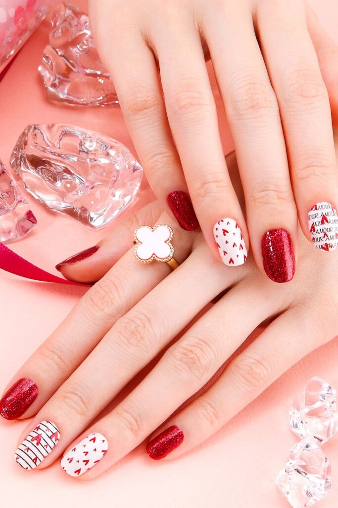 This playful manicure mixes sparkling red nails with white accent nails featuring tiny hearts and romantic lettering.