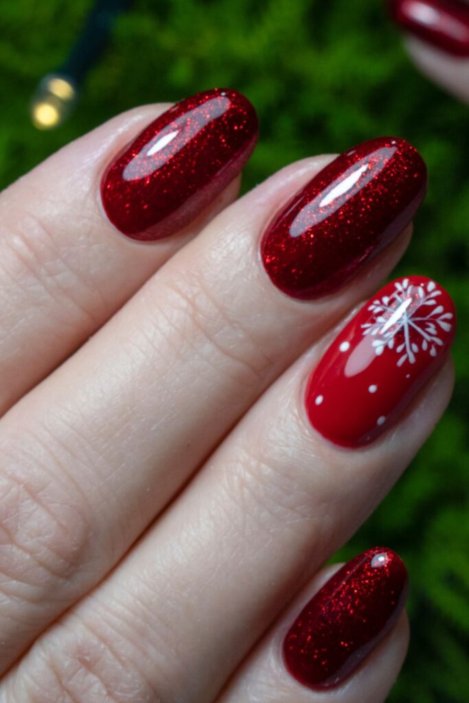 These glittery red nails paired with a delicate snowflake accent nail are a winter dream. The bold sparkle keeps things festive, while the white detailing adds a soft seasonal charm.