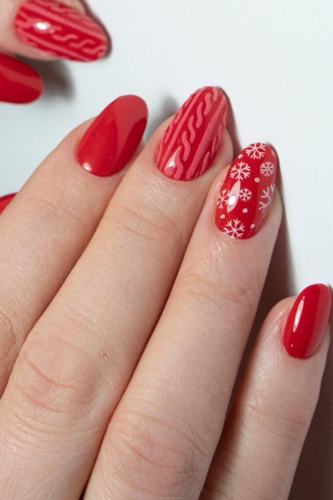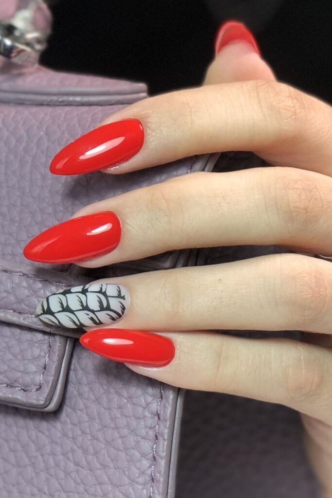 Bright and glossy red nails take stage here, but the standout is the single accent nail with a cozy knit design in neutral tones.