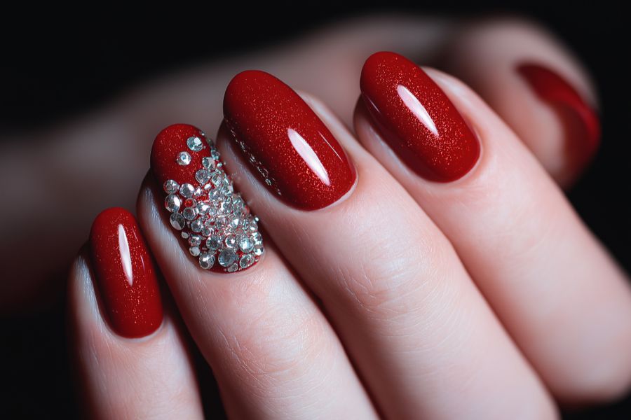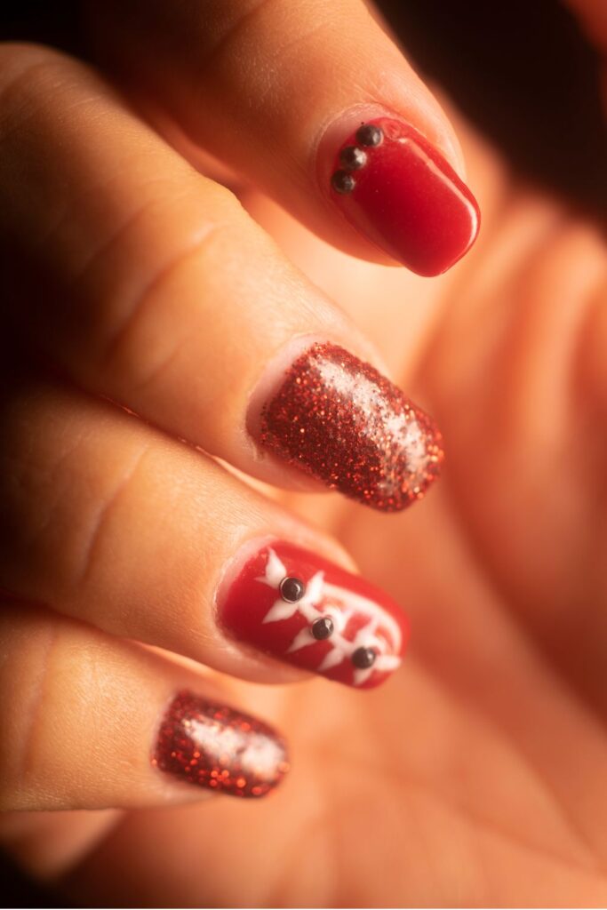 This design is all about texture and sparkle. We’ve got bold red nails enhanced with glitter and tiny black studs, making the whole look very edgy.
