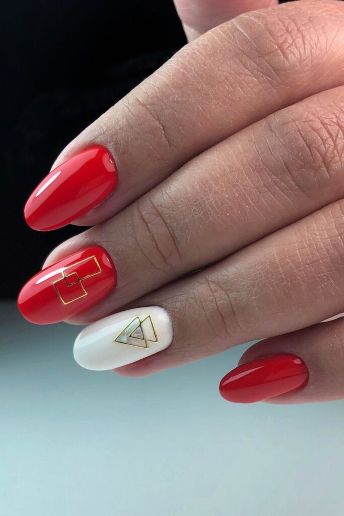 This sleek design pairs glossy red nails with a white accent nail, elevated by modern geometric gold details. It’s clean, stylish, and a little artsy too.