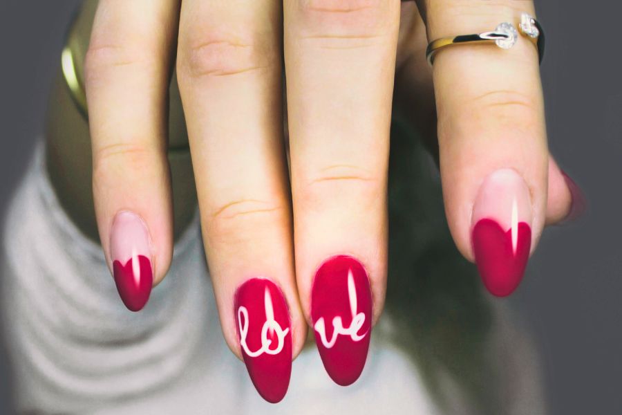This romantic design features heart-shaped red tips on a nude base, with two accent nails spelling out ‘love’ in elegant white script.