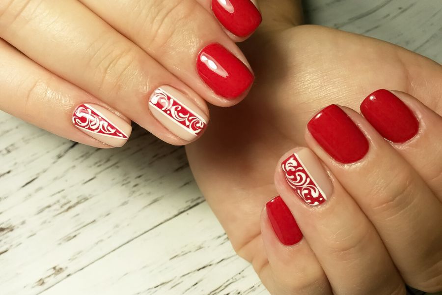 This design combines bold red nails with nude accent nails decorated with delicate red swirls for a classy and creative look.