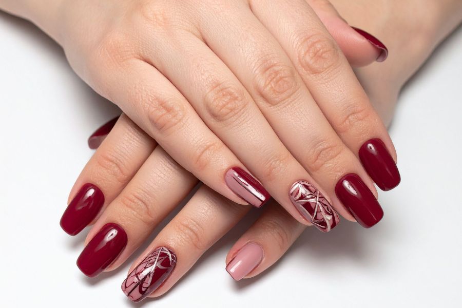 This elegant manicure blends deep burgundy with soft blush tones and intricate line art on the accent nails.