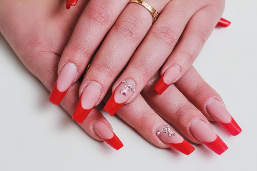 These long coffin nails feature bold red French tips over a nude base, finished with delicate rhinestone accents.