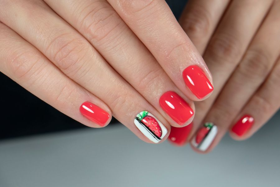 Fresh and playful, this design pairs bright red nails with adorable strawberry-themed accent art.
