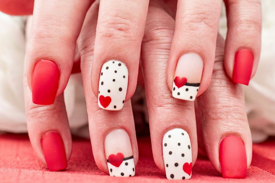 Matte red nails have been paired with white accent nails, which have black polka dots and adorable red hearts.