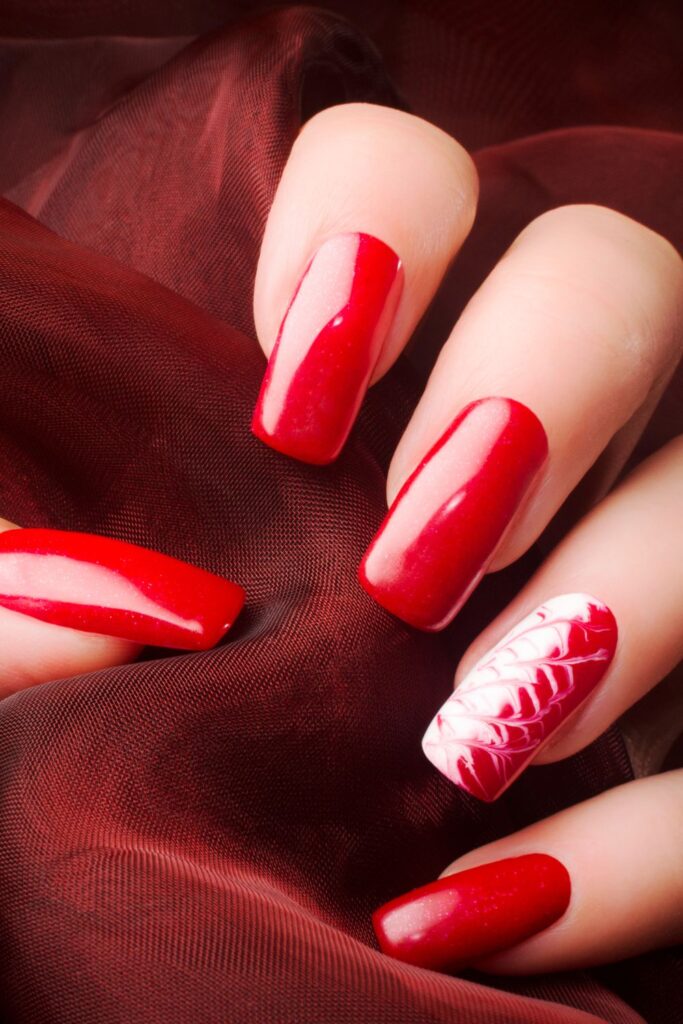 This design brings together glossy red nails with an artistic white marble accent. It’s a very chic and modern look.