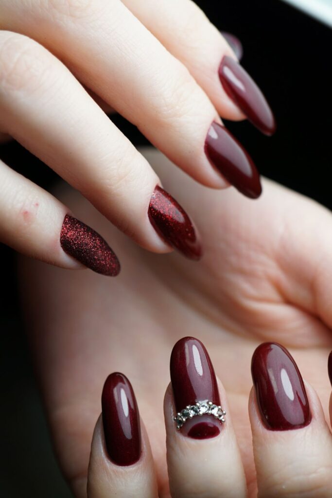 We have rich burgundy nails with a mix of glossy and glitter finishes. Pure sophistication!