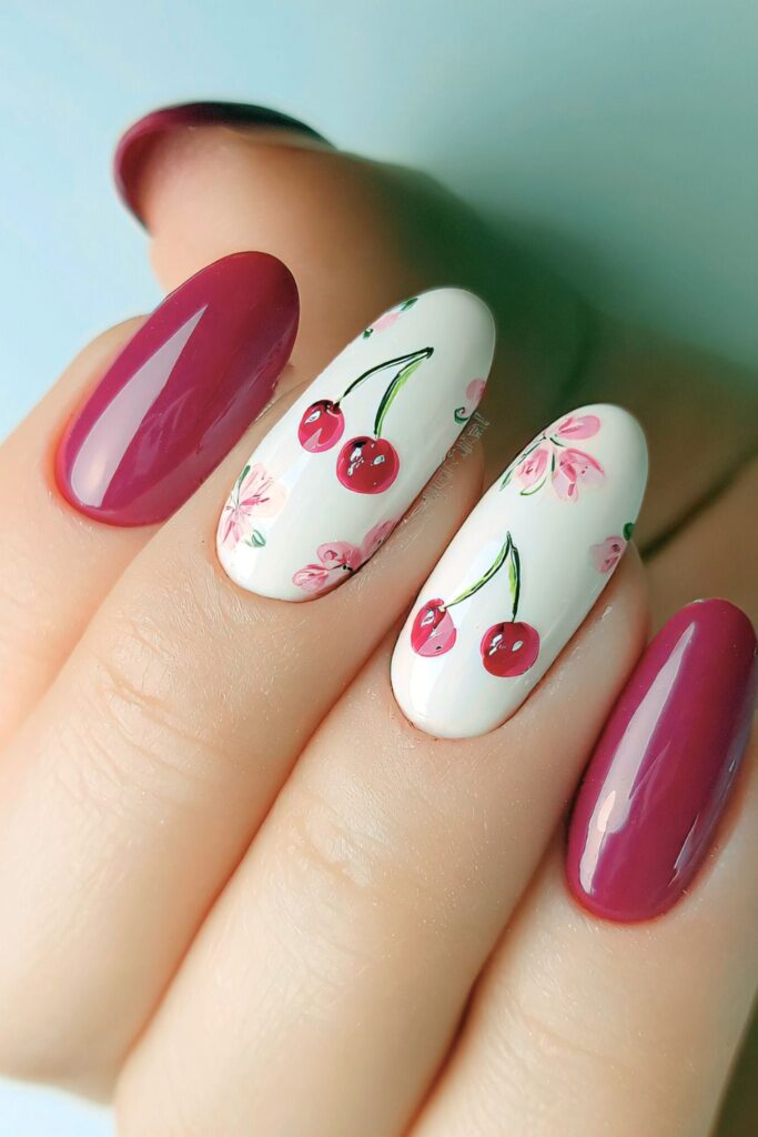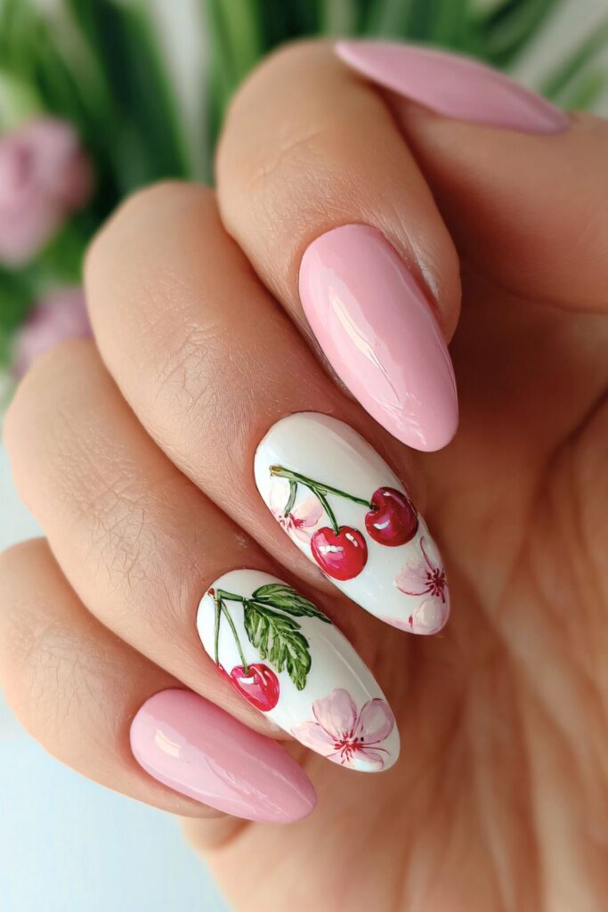 On one hand, we have soft baby pink nails on three nails, and on the two two, we have creamy white accents with cherries and floral details.