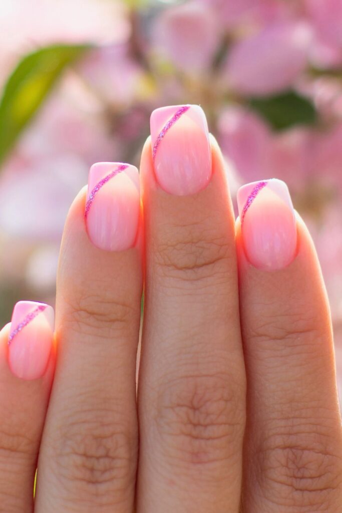 The soft blush base keeps everything looking clean and natural, while the diagonal pink shimmer line adds just enough interest without feeling heavy.