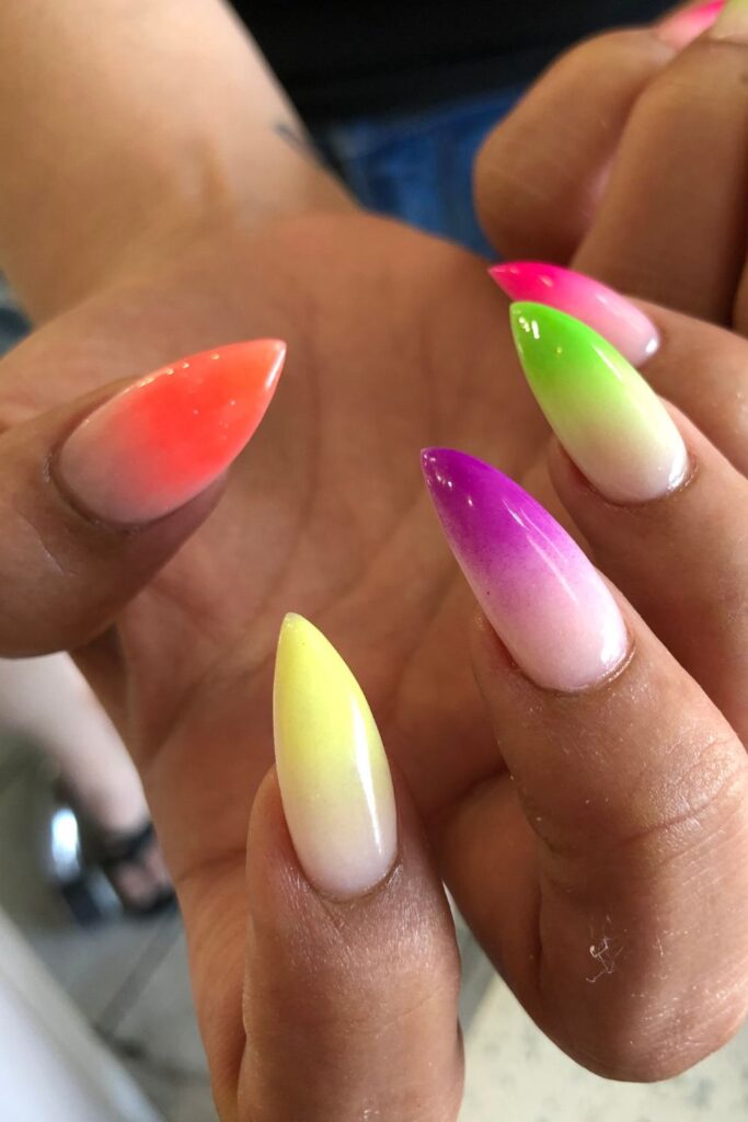 The neon ombre effect blends bright spring shades into a milky base, creating a bold but wearable look.