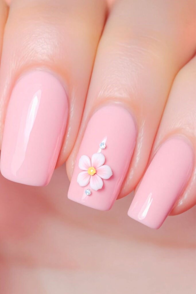 The glossy baby pink base is clean, feminine, and timeless, while the tiny 3D flower detail adds a sweet and romantic touch.