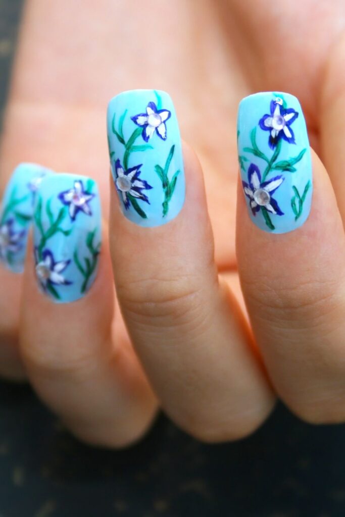 4. Sky Blue Floral Nails with a Vintage Feel