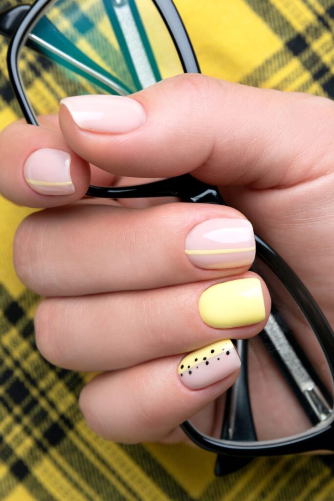 The mix of soft nude and pastel yellow keeps the palette light and spring-ready, while the thin lines and tiny dot details add just enough visual interest.