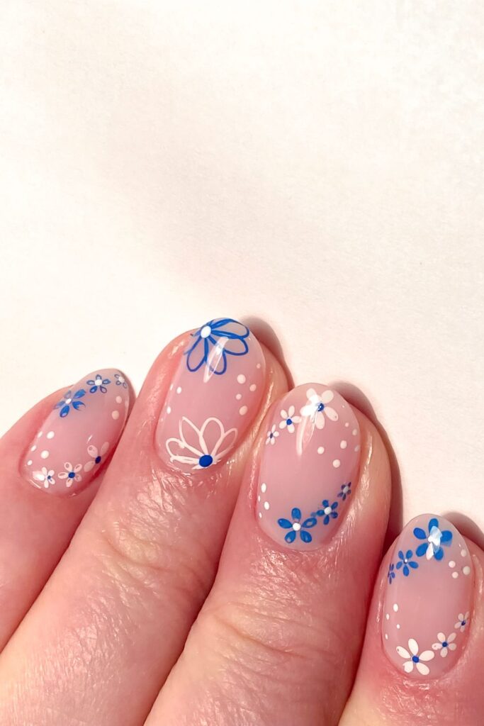 7. Sheer Floral Nails with a Blue Touch