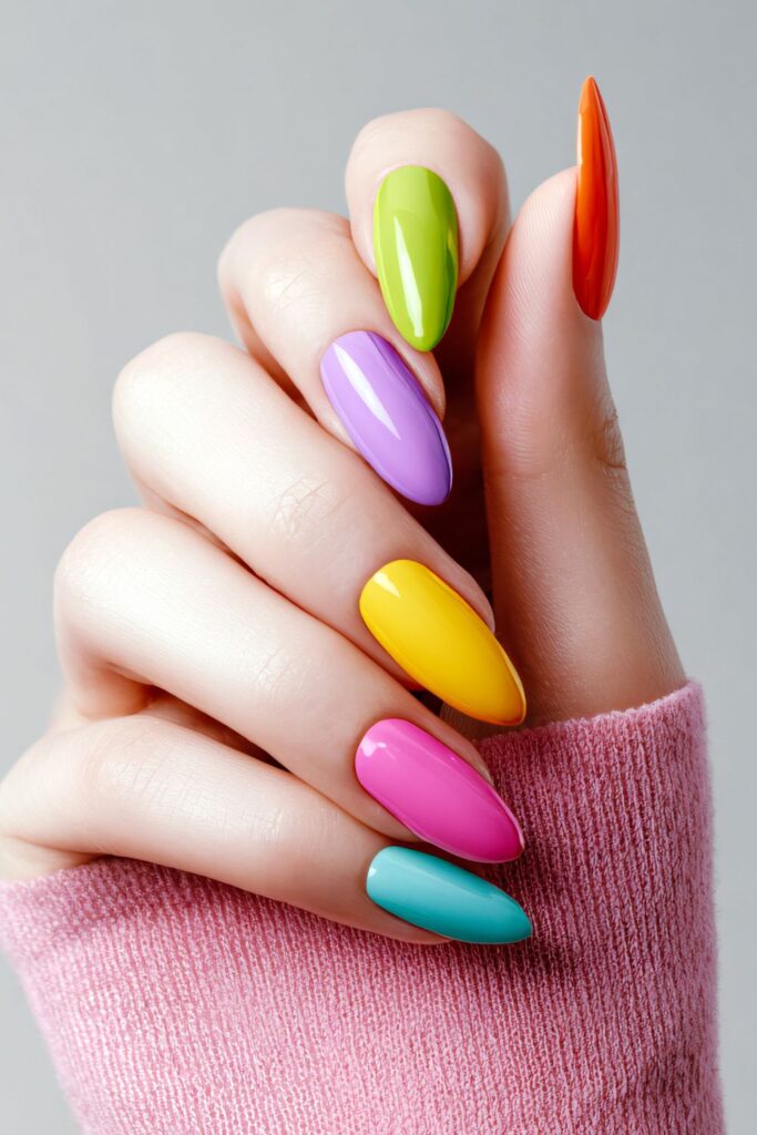 Each nail features a different pastel-bright shade, creating a playful rainbow effect that is fun, confident, and full of life.