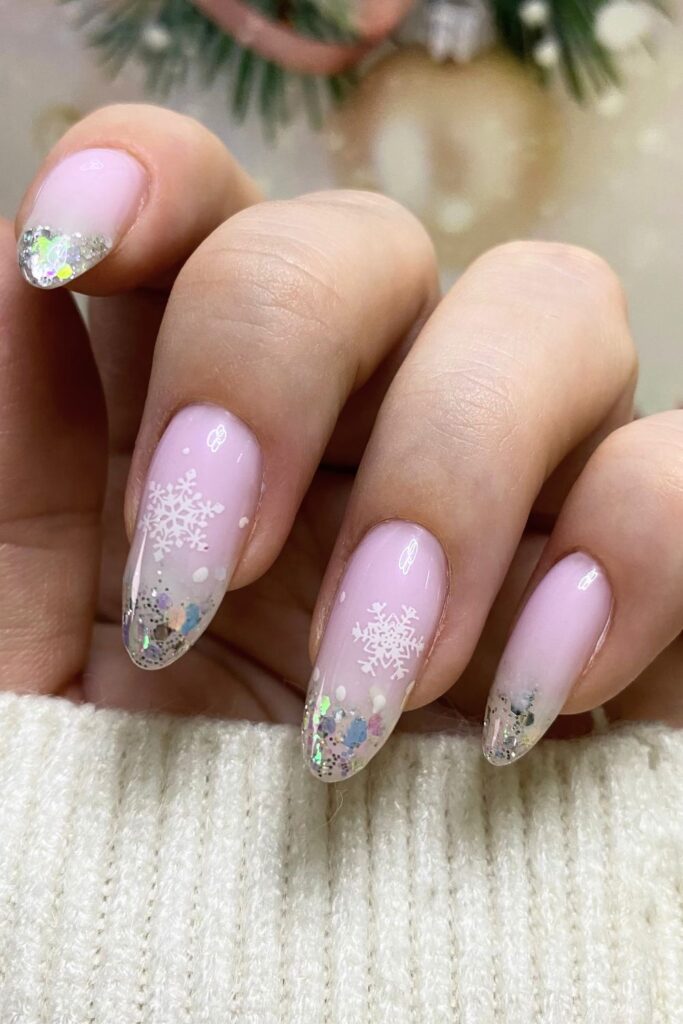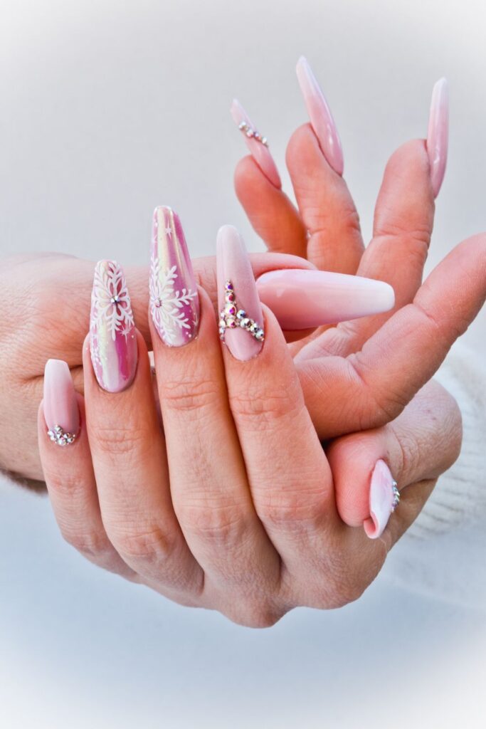 Baby pink base with delicate white snowflakes and chunky glitter at the tips. It’s like a cozy winter sweater but glam at the same time.