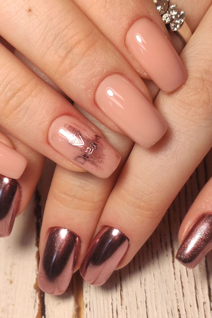 Want something soft yet glam? Then try these glossy nude pink and mirror-like rose gold chrome nails. An absolute knockout!