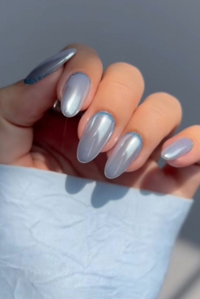 The soft silver chrome base has a delicate shimmer that catches light beautifully. And there’s also subtle blue glitter on cuticle, adding just the right amount of icy edge.