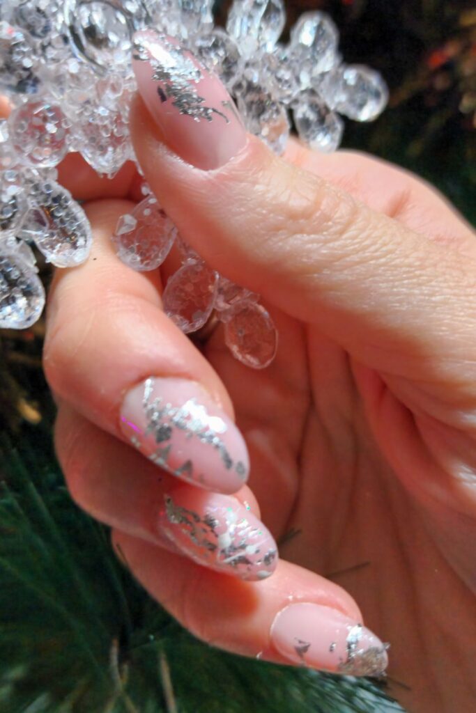 These nails feature a sheer pink base sprinkled with bold silver foil, giving that perfect snowy-glitter illusion. It’s festive without being overdone and has a cool modern vibe.