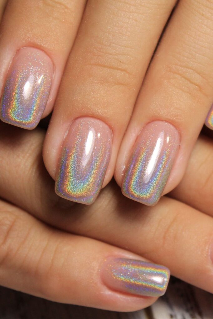 These nails are a full-on light show! A subtle nude base paired with bold holographic chrome gives you that mesmerizing rainbow shift in every angle.