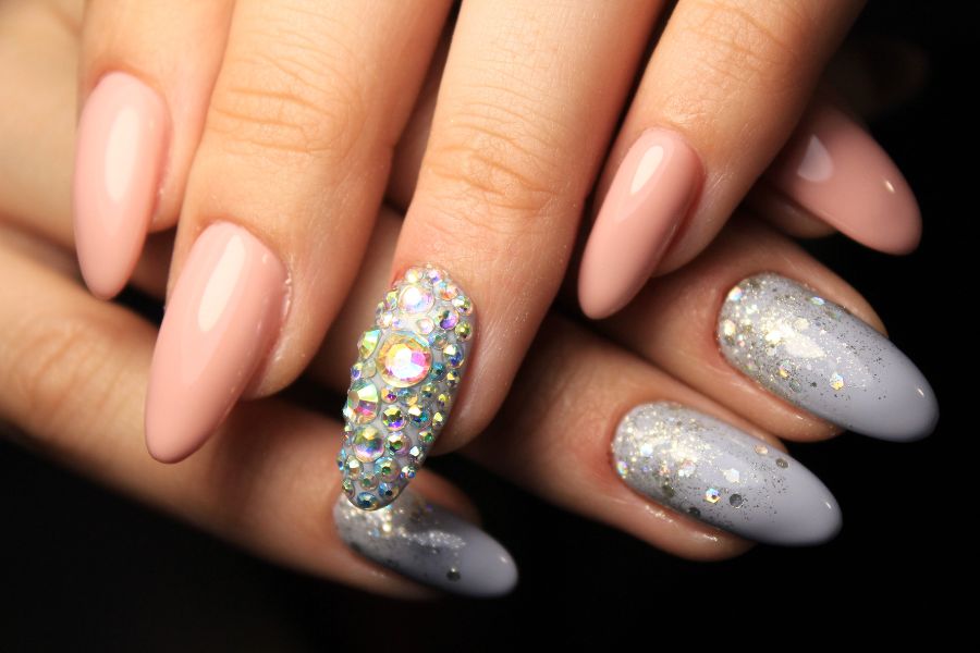 We have a beautiful blend of soft blush pink and icy silver glitter, topped off with a blinding rhinestone-covered accent nail.