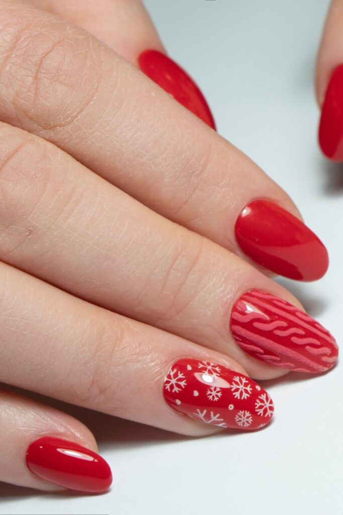 This bright holiday red gets two standout accents: one with dainty snowflakes and one with a textured sweater pattern that feels oh-so-cozy.