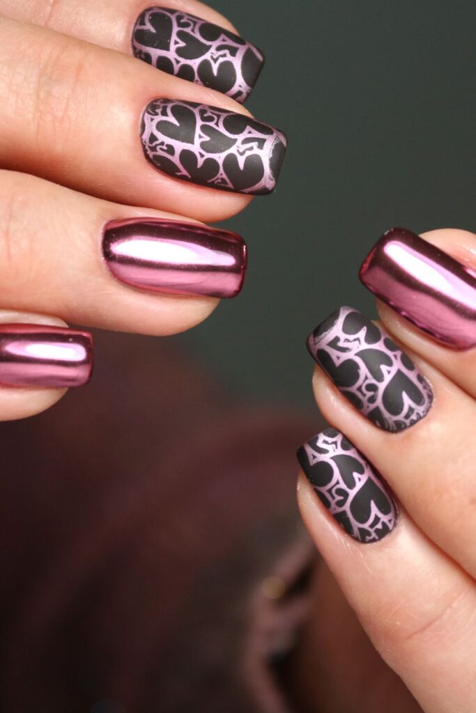 Talk about edgy romance! These nails combine glossy rose-chrome with matte black-and-pink heart designs for the ultimate winter statement.