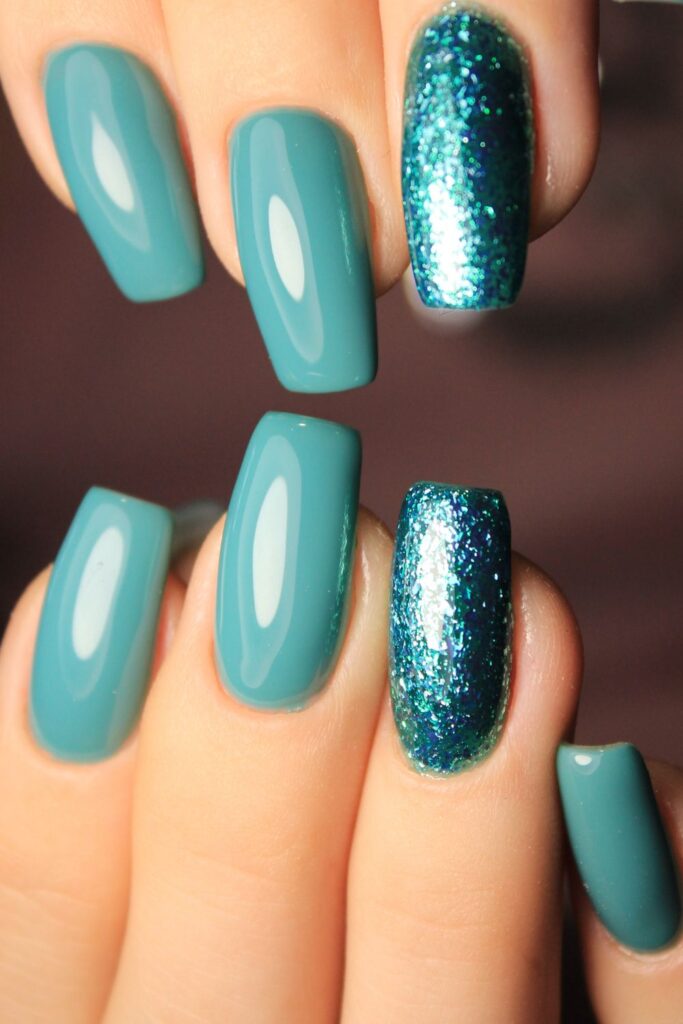 Deep teal nails with a hint of shine meet bold, glitter-packed accent nails in a cooler-than-ice combo. The glitter shifts from teal to icy blue, giving major frozen-lake vibes.