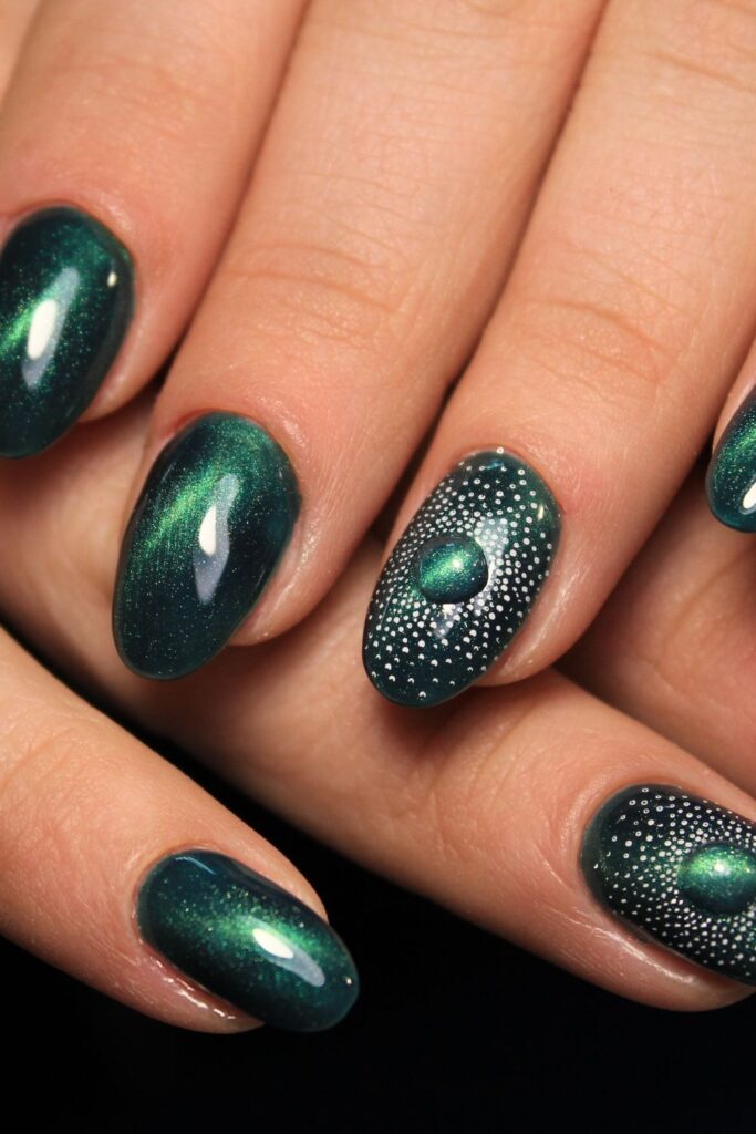 These deep green nails are like peeking into another universe. The magnetic shimmer plus those tiny white dotted accents create a galaxy effect that’s next-level stunning.
