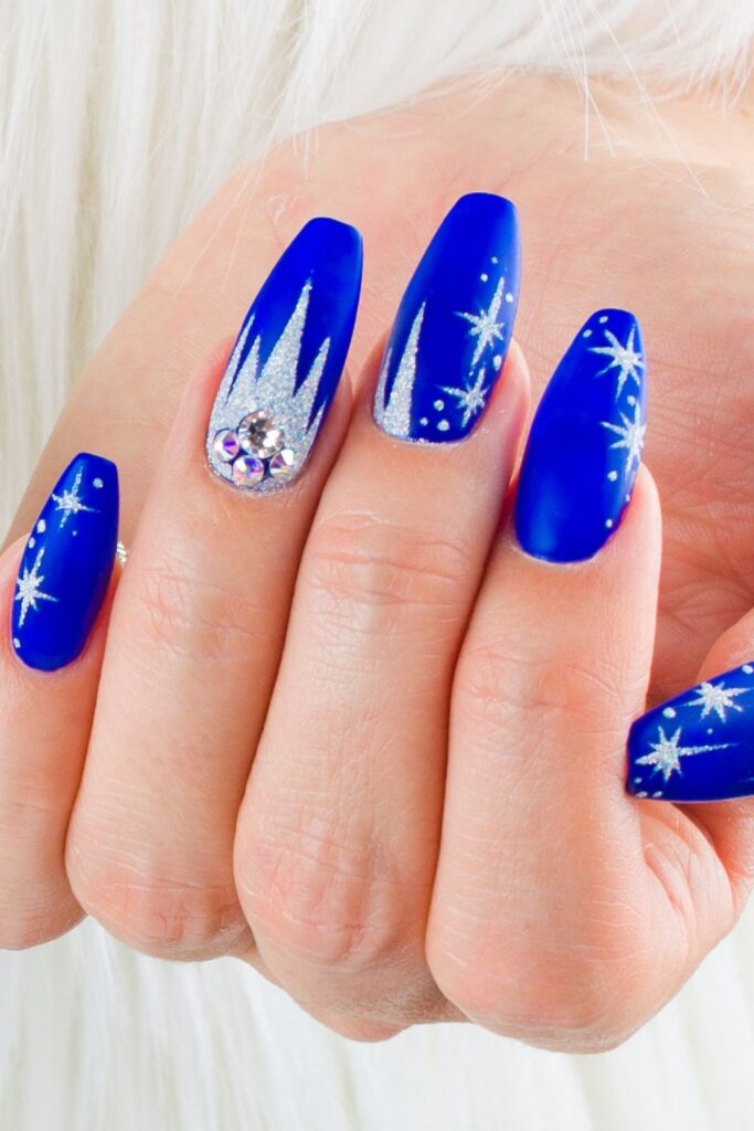 The nails are painted a bold, royal blue, which is a timeless winter shade. On top, you have sparkling silver starbursts and shooting star designs, which give an almost celestial vibe.