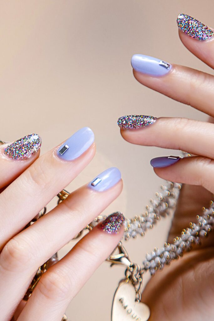 This set is pure winter glam. Half the nails are rocking that icy lavender shade, while the others are drenched in multi-colored glitter for a party-ready finish.
