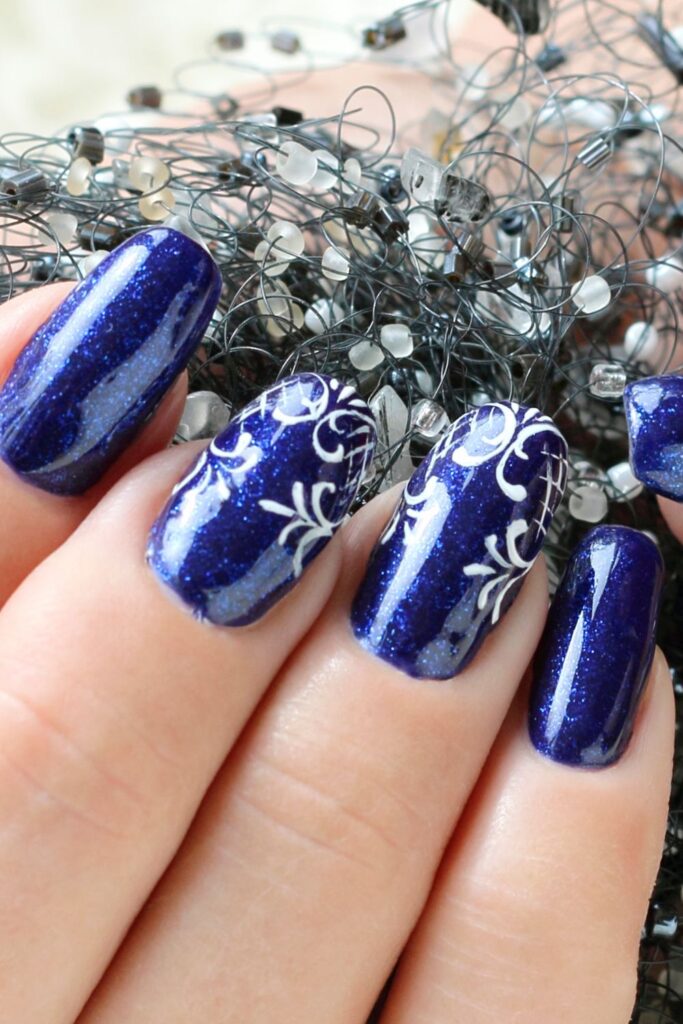 If winter had a signature shade, this deep, sparkly midnight blue would be it. Add those delicate white swirls and flourishes, and you’ve got nails that scream ‘snow queen energy’.