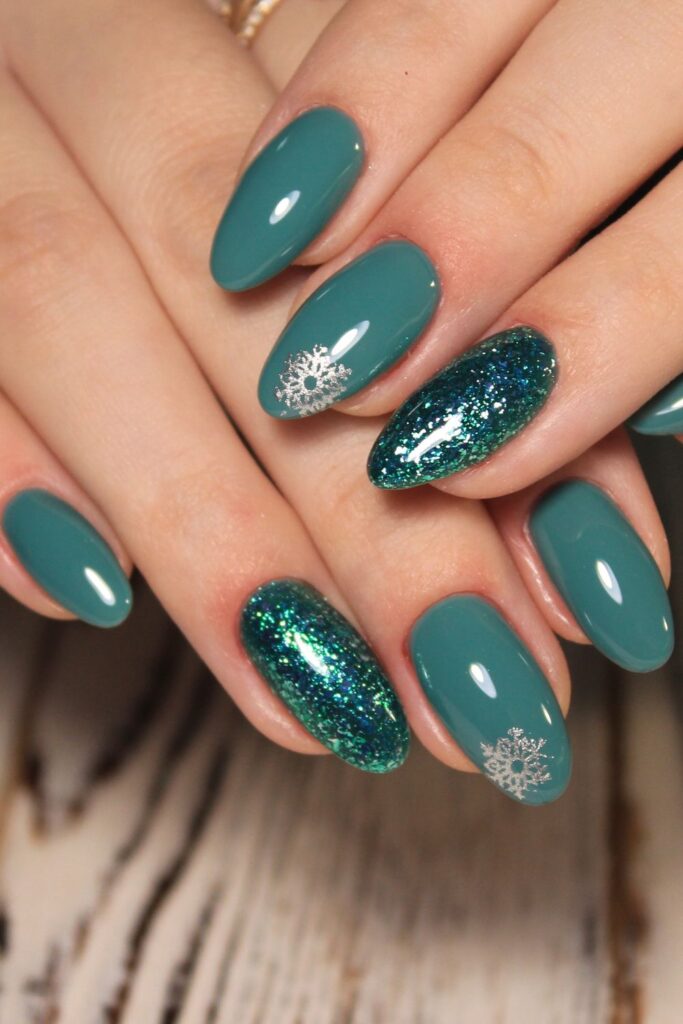 This one is giving major icy forest vibes. The rich teal base is already stunning, but those glittery green accent nails are just stunning.
