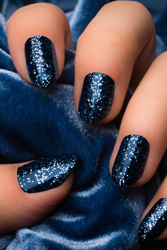 Dark navy nails sprinkled with silver glitter? I mean, it’s winter, so why not? These nails will give you pure midnight sky vibes.