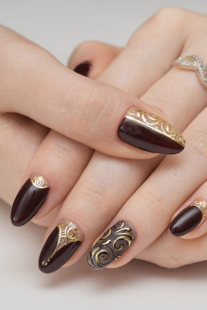 This combo is the definition of classy winter nails. The deep burgundy base is bold and rich, while those gold swirl accents add just the right amount of festive drama.