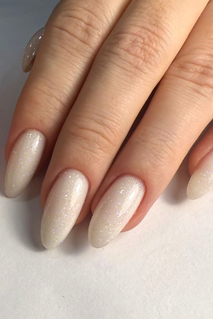 If you’re a fan of neutral tones but want a little winter sparkle, these nails are perfection. The soft beige base gets a frosty twist with that subtle shimmer running through it.