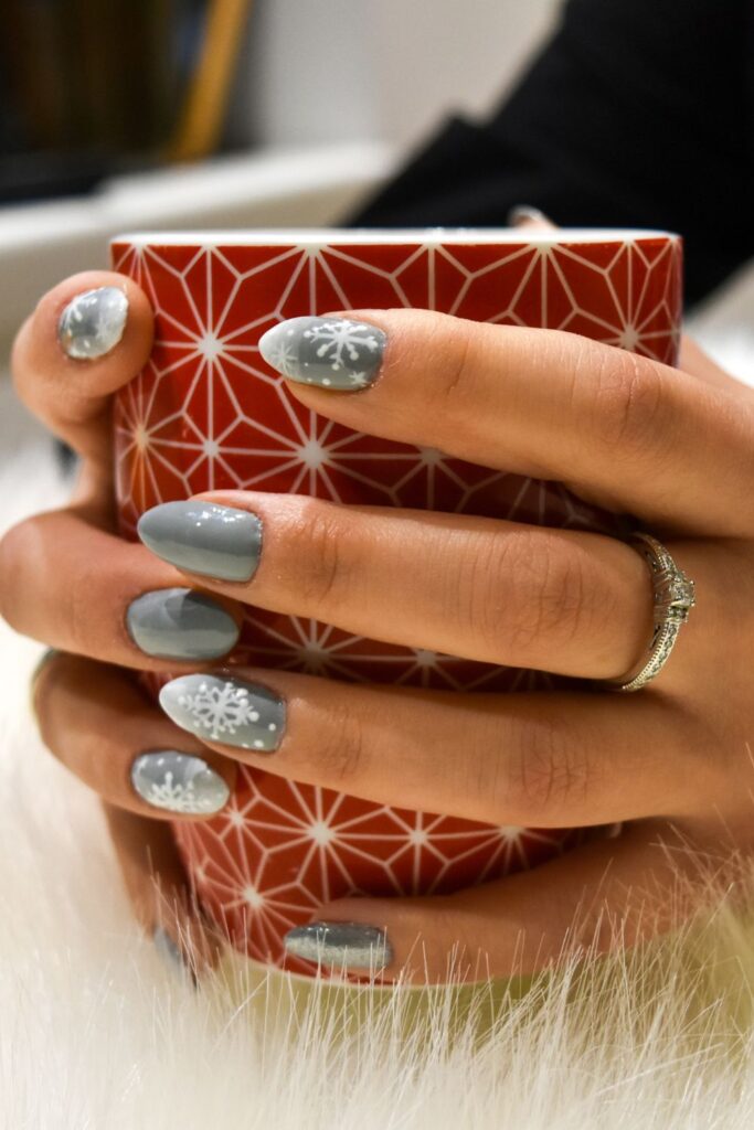 Gray base topped with crisp white snowflakes. Ultimate winter energy! It’s giving hot cocoa in hand, fairy lights twinkling in the background vibes.